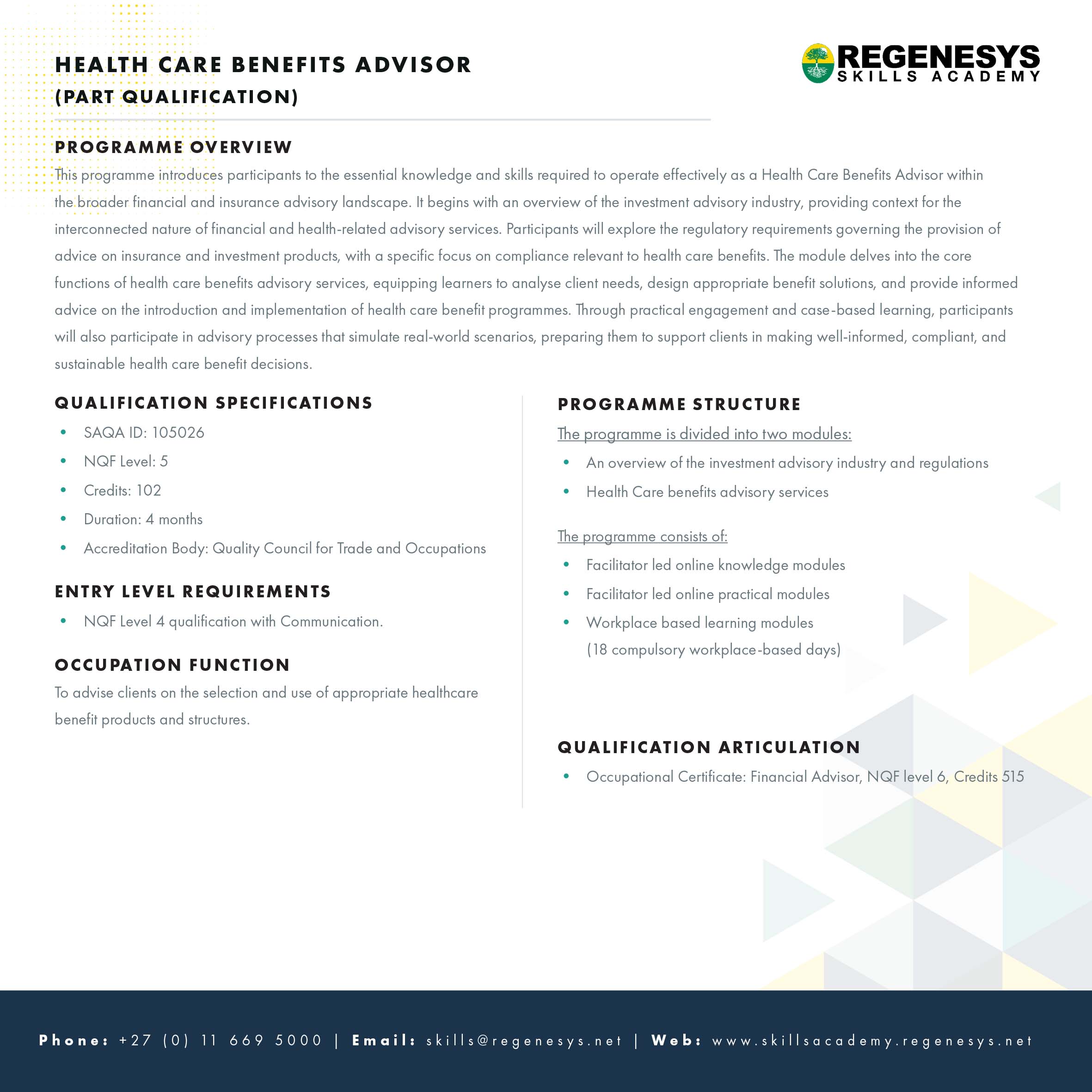 This programme introduces participants to the essential knowledge and skills required to operate effectively as a Health Care Benefits Advisor within the broader financial and insurance advisory landscape. It begins with an overview of the investment advisory industry, providing context for the interconnected nature of financial and health-related advisory services. Participants will explore the regulatory requirements governing the provision of advice on insurance and investment products, with a specific focus on compliance relevant to health care benefits. The module delves into the core functions of health care benefits advisory services, equipping learners to analyse client needs, design appropriate benefit solutions, and provide informed advice on the introduction and implementation of health care benefit programmes. Through practical engagement and case-based learning, participants will also participate in advisory processes that simulate real-world scenarios, preparing them to support clients in making well-informed, compliant, and sustainable health care benefit decisions.