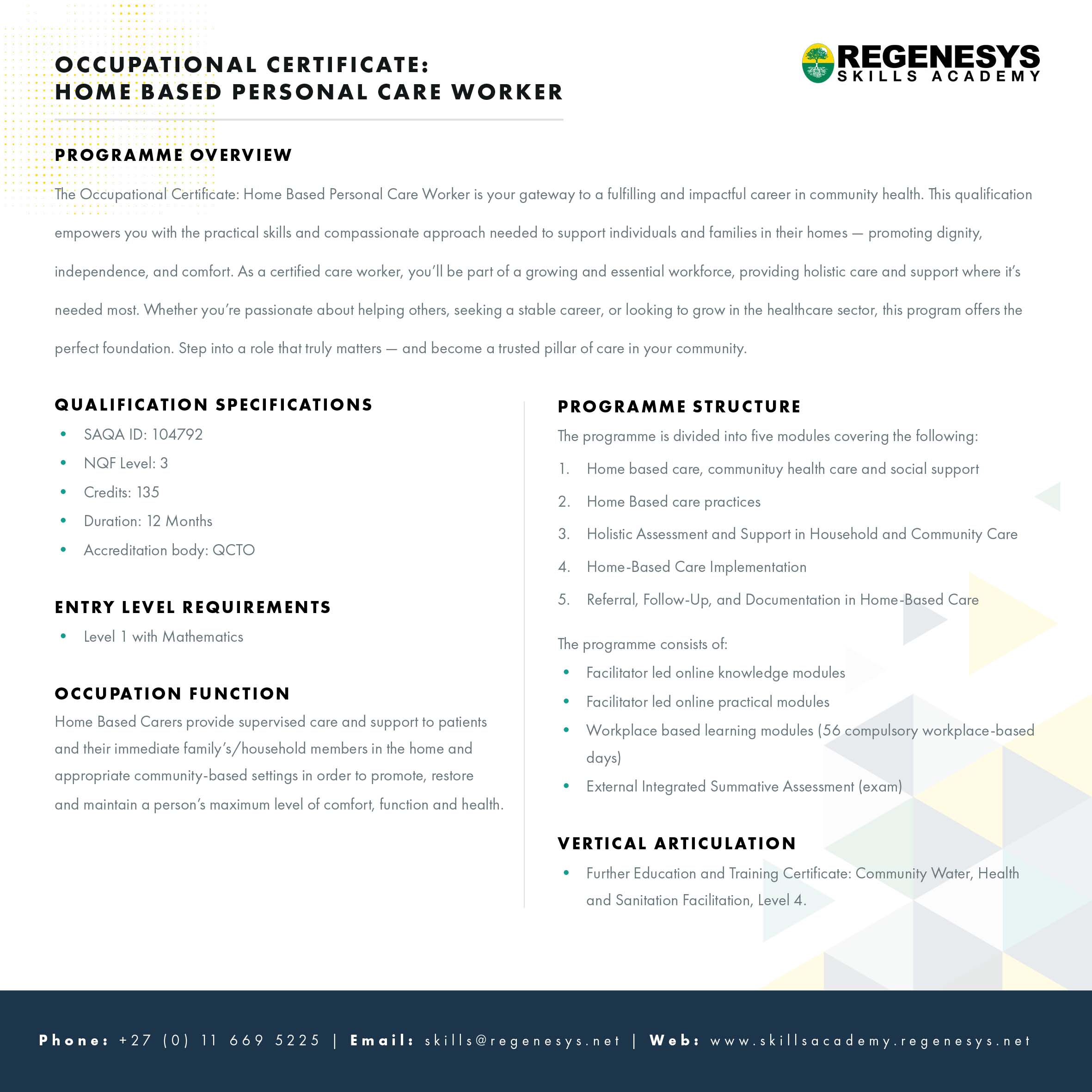 The Occupational Certificate: Home Based Personal Care Worker is your gateway to a fulfilling and impactful career in community health. This qualification empowers you with the practical skills and compassionate approach needed to support individuals and families in their homes, promoting dignity, independence, and comfort. As a certified care worker, you’ll be part of a growing and essential workforce, providing holistic care and support where it’s needed most. Whether you’re passionate about helping others, seeking a stable career, or looking to grow in the healthcare sector, this program offers the perfect foundation. Step into a role that truly matters and become a trusted pillar of care in your community.