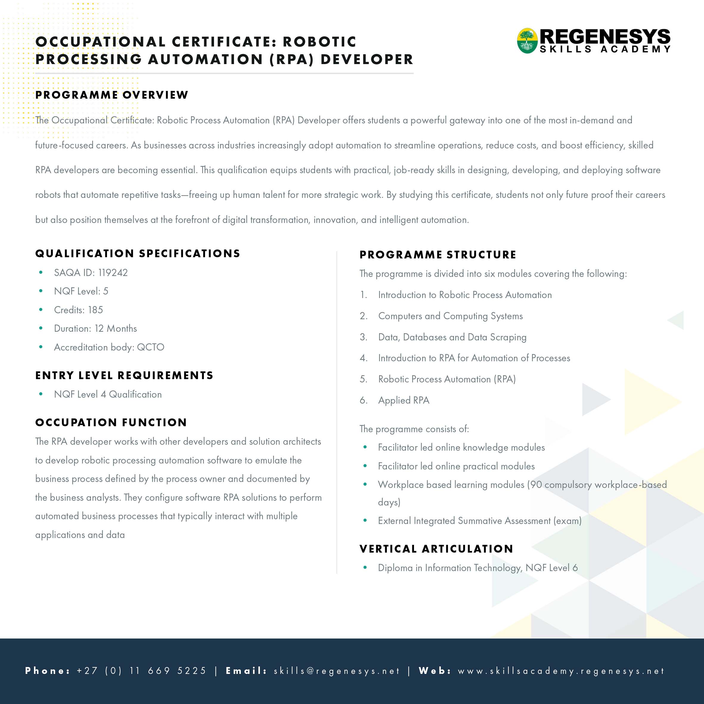 The Occupational Certificate: Robotic Process Automation (RPA) Developer offers students a powerful gateway into one of the most in-demand and future-focused careers. As businesses across industries increasingly adopt automation to streamline operations, reduce costs, and boost efficiency, skilled RPA developers are becoming essential. This qualification equips students with practical, job-ready skills in designing, developing, and deploying software robots that automate repetitive tasks, freeing up human talent for more strategic work. By studying this certificate, students not only future-proof their careers but also position themselves at the forefront of digital transformation, innovation, and intelligent automation.
